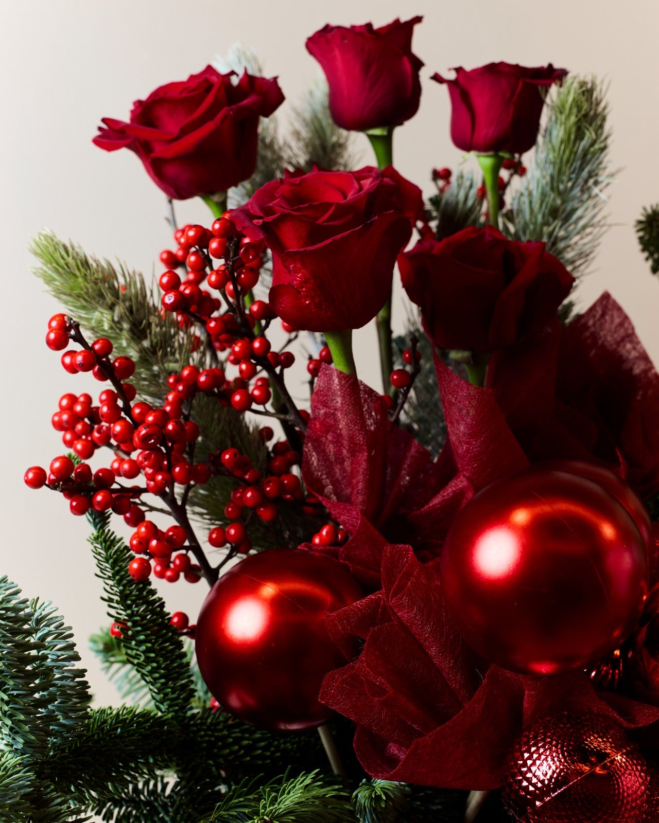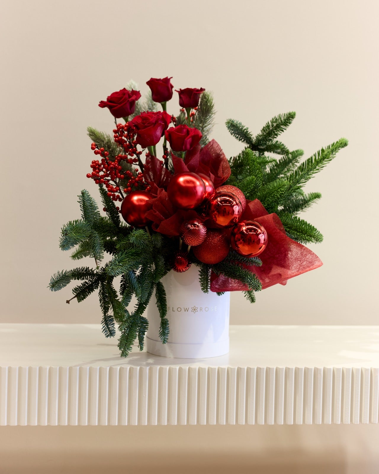Crimson Eve is designed for those who love deep festive tones. With premium red roses, vibrant berries, and glossy ornaments, this arrangement creates a striking Christmas statement. The design sits beautifully in our Flowrose box, making it ideal for gifting or elevating your seasonal décor.