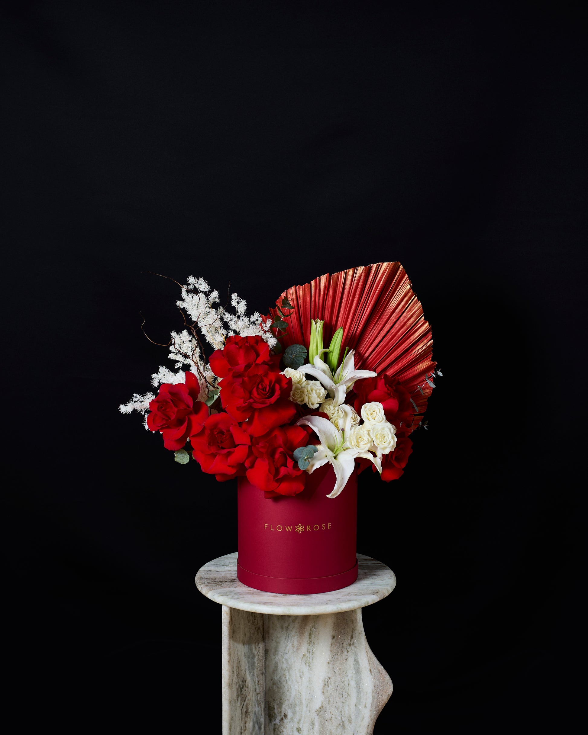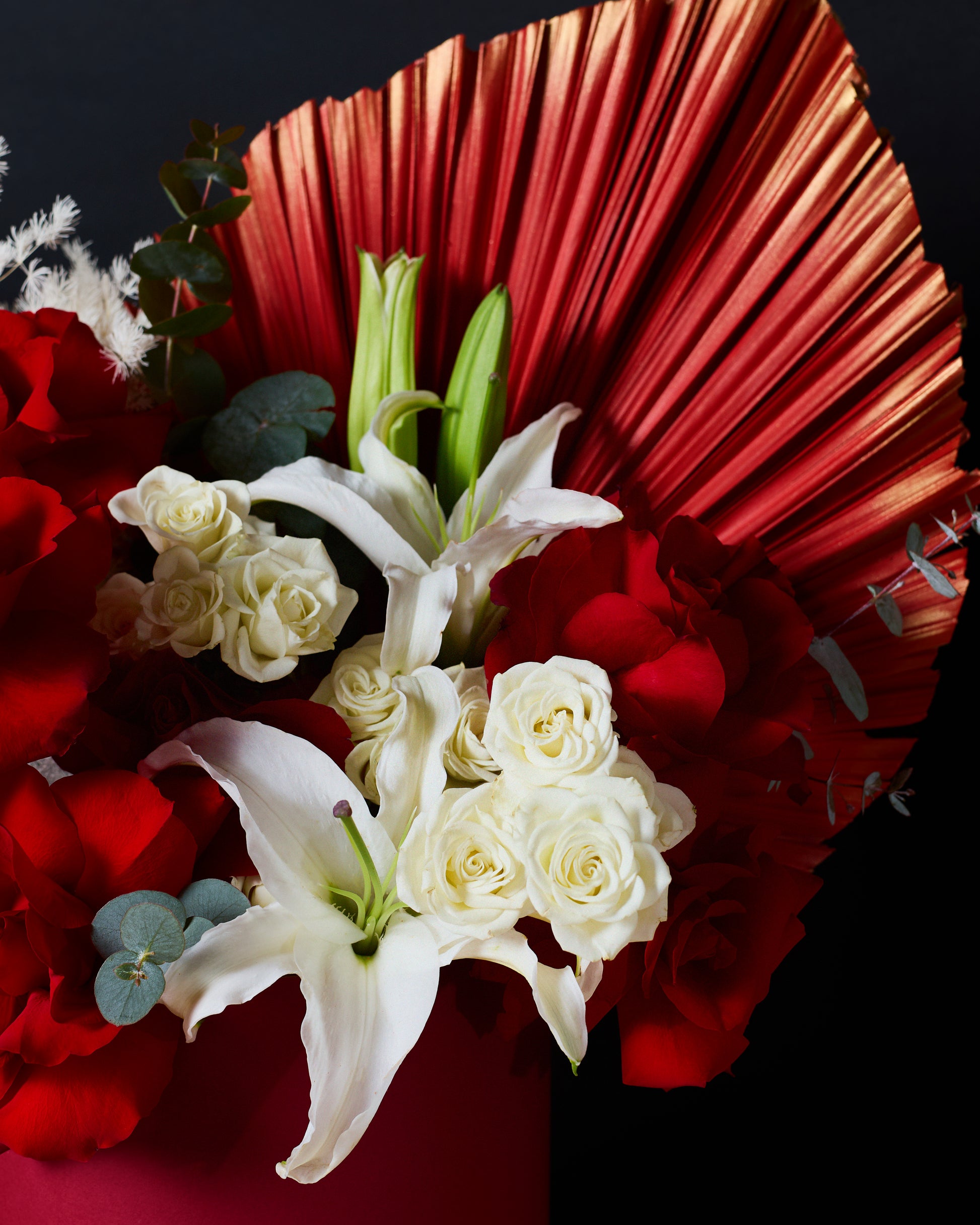 Empress Noire is a regal composition of velvety red roses contrasted with pure white spray roses and graceful white lilies. Framed by sculptural palm leaves, flowing saliks, airy white asparagus, and fresh eucalyptus, this arrangement embodies strength, balance, and refined elegance. Presented in our signature hatbox, Empress Noire is a statement of confidence, sophistication, and timeless beauty.