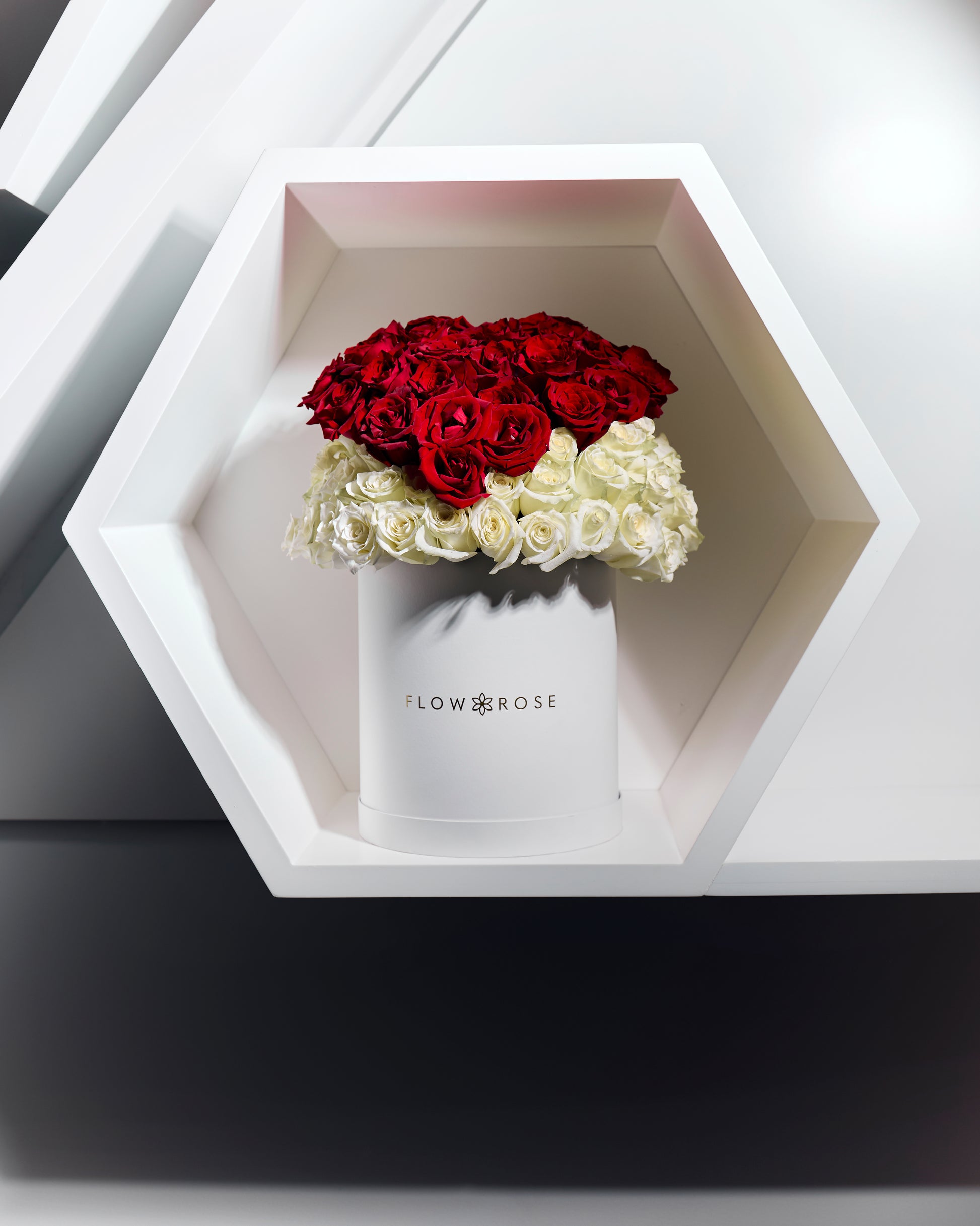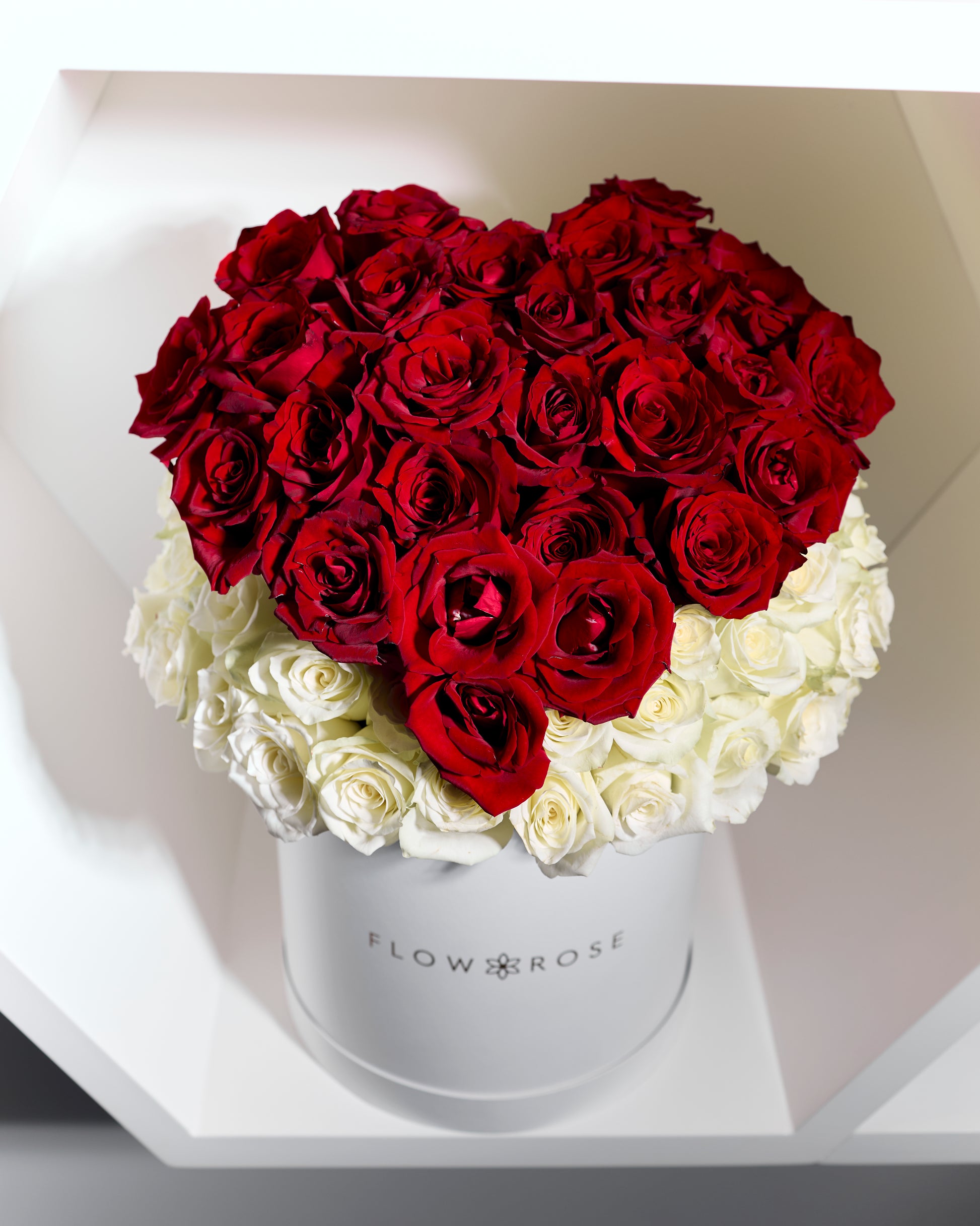 The Love Box is a timeless expression of romance, featuring a heart-shaped arrangement of velvety red roses embraced by pure white roses. The striking contrast of passion and purity creates an elegant and meaningful design. Presented in our signature box, The Love Box is a classic symbol of love bold, heartfelt, and unforgettable.